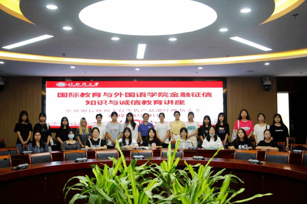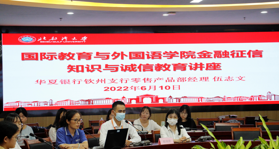 为进一步加强我院学生的诚信和责任意识,强化资助育人实效。国际教育与外国语学院于2022年6月10日下午3:15在国外院222会议厅举办了金融征信知识与诚信教育讲座,本次会议由学工办蓝水萍、华夏银行钦州支行零售产品部经理伍志文、生源地助学贷款学生参与,并由英语本201班罗丽萍主持。