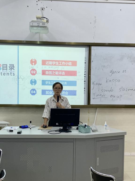 会议上,蓝水萍老师总结了近段时间以来学院的学生工作。主要工作包括:近期学生工作小结、自强之星评选、学生工作案例交流、就业工作推进。在就业工作推进方面,蓝水萍老师先进行通报了我院的就业情况,接着老师们汇报了自己所带学生的就业现状,最后是推进低收入家庭毕业生就业帮扶的工作。