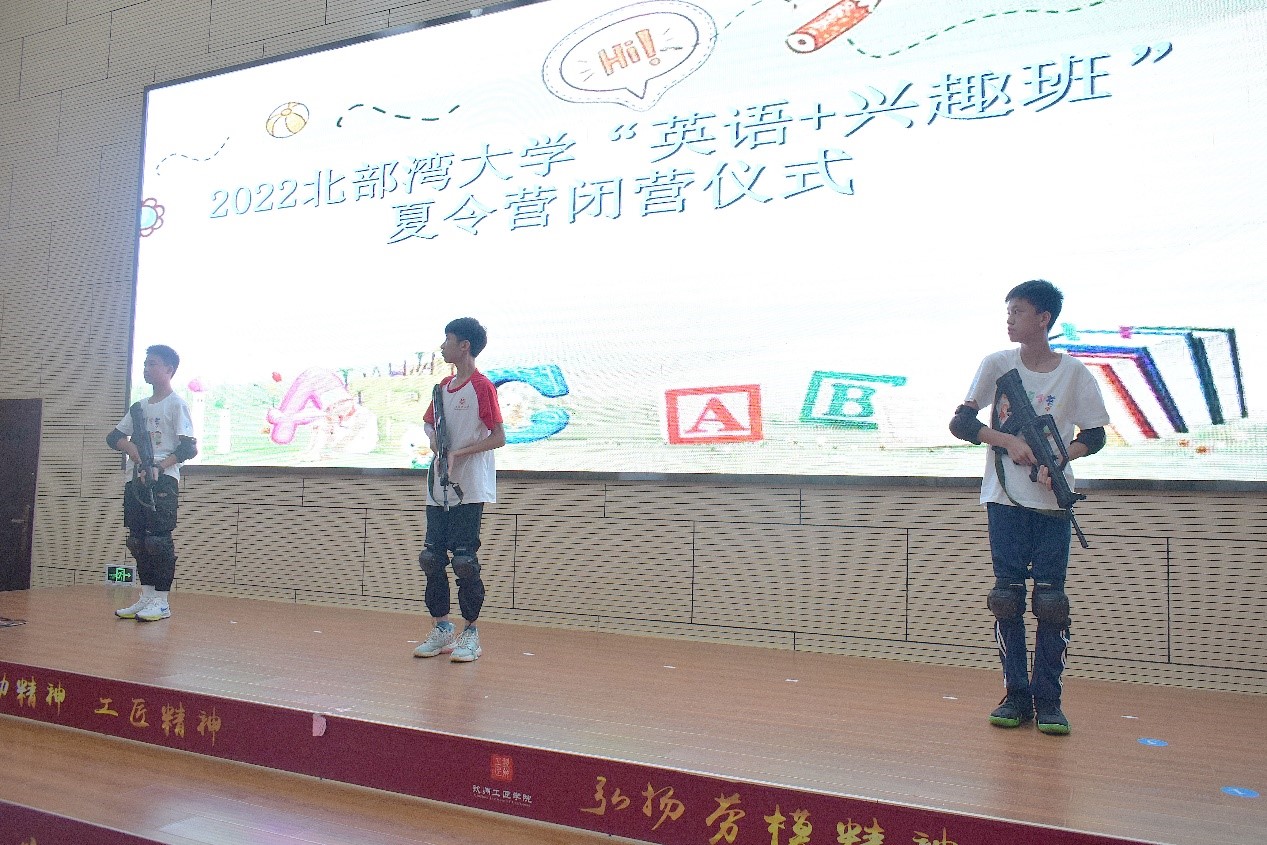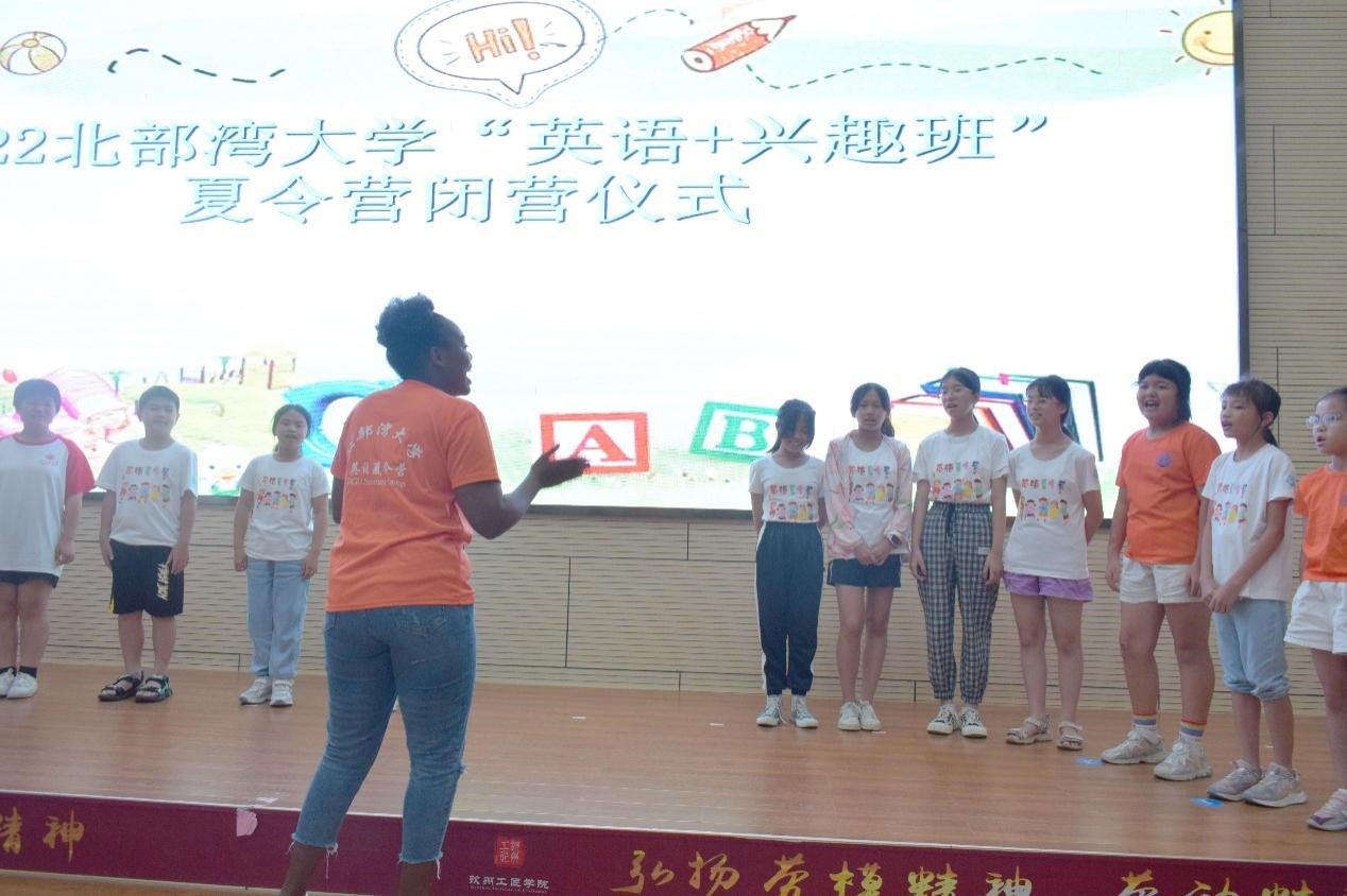 2022年7月16日上午,2022年北部湾大学“英语+兴趣班”夏令营在东密歇根联合工程学院301路演厅举行闭营仪式。英文合唱、英语配音、军事表演……夏令营的老师和小学员为家长们呈现了一台精彩演出,展现了一周的学习成果。