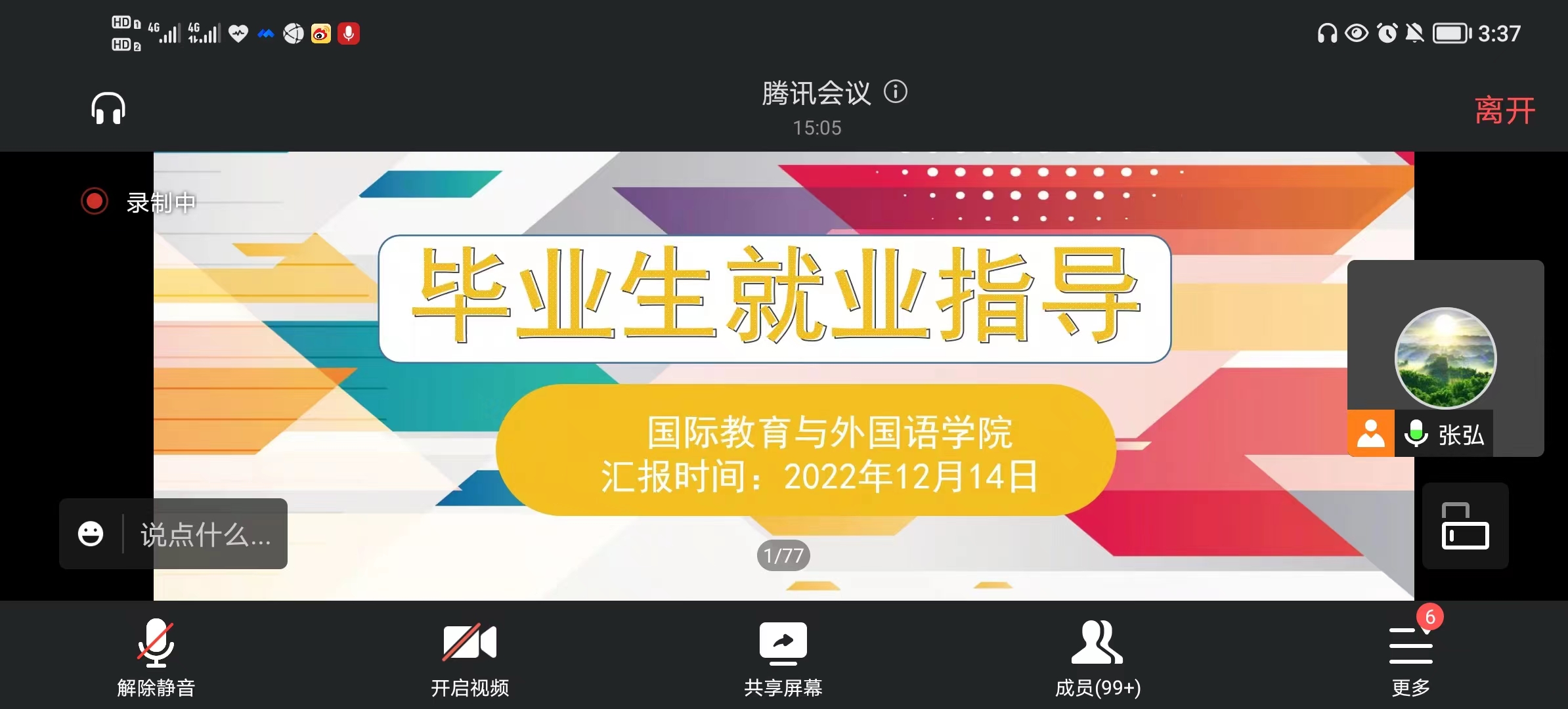 2022年12月14日,为更好地指导毕业生就业,让毕业生更深入了解当下就业形势,国际教育与外国语学院“筑梦引领,扬帆起航”毕业生就业指导讲座在线上平台顺利举办。参加本次会议的有学院党委副书记伍红艺、辅导员蓝水萍、张弘、罗如云及2023届毕业生、部分2020级学生。