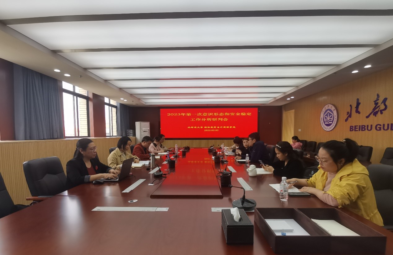 会议为学习和贯彻学校意识形态精神,压实压紧各单位部门的意识形态工作主体责任,不断加强和改进意识形态和安全稳定工作,3月2日下午,国际教育与外国语学院党委在国际教育与外国语学院346室召开2023年第一次意识形态和安全稳定工作分析研判会。