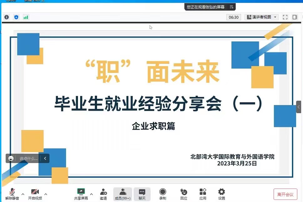 为了帮助2023届未就业学生了解就业形势,提高学生就业竞争力,促使同学们更加充分更高质量就业。国际教育与外国语学院组织开展“‘职’面未来:2023届毕业生就业经验专题分享会”。2023年3月25日下午,“经验分享会(一)企业求职篇”于线上平台顺利召开。主讲人为英语本192班袁将同学。我院张弘老师、罗如云老师和全体2023届毕业生参加本次分享会。
