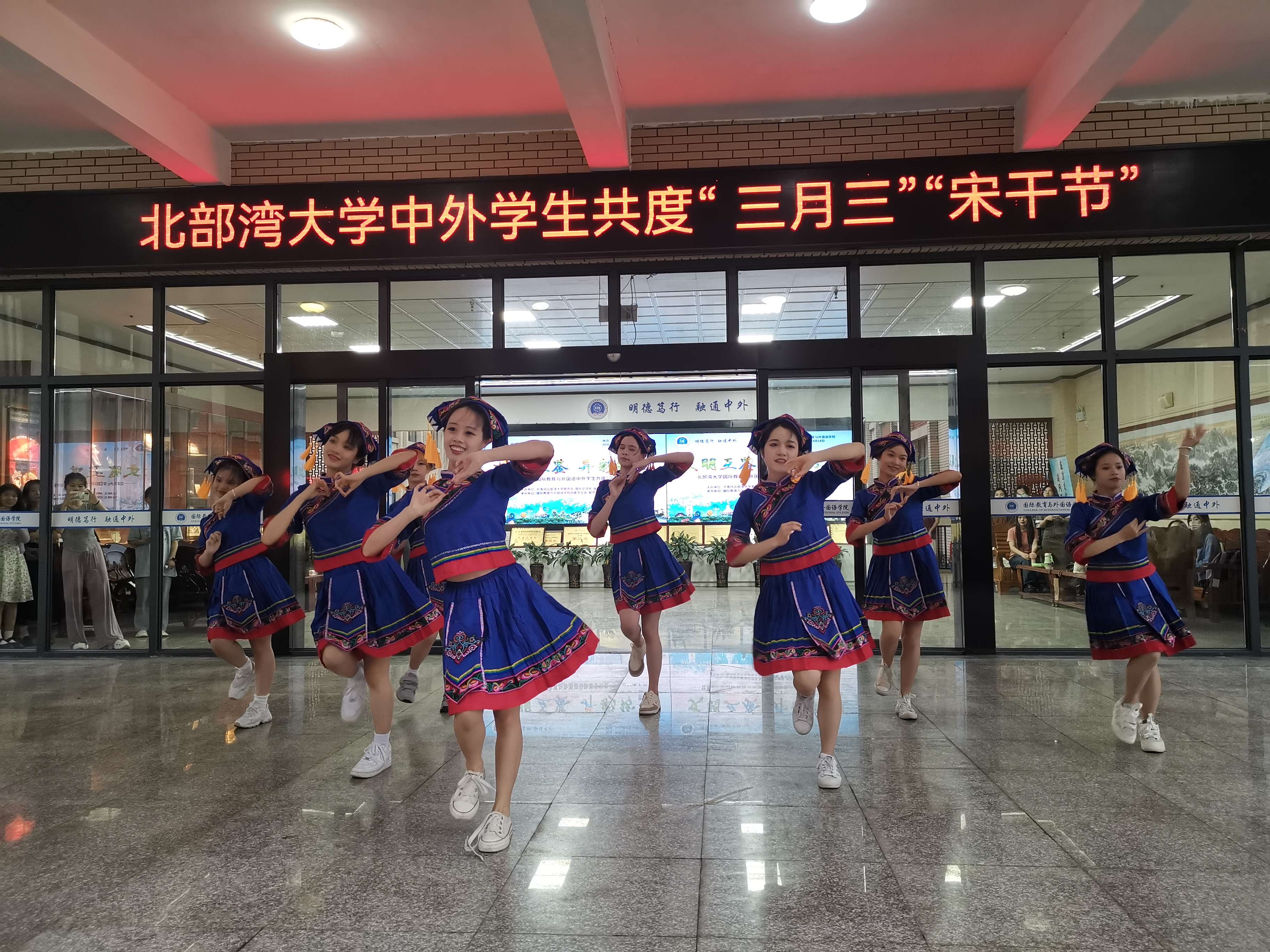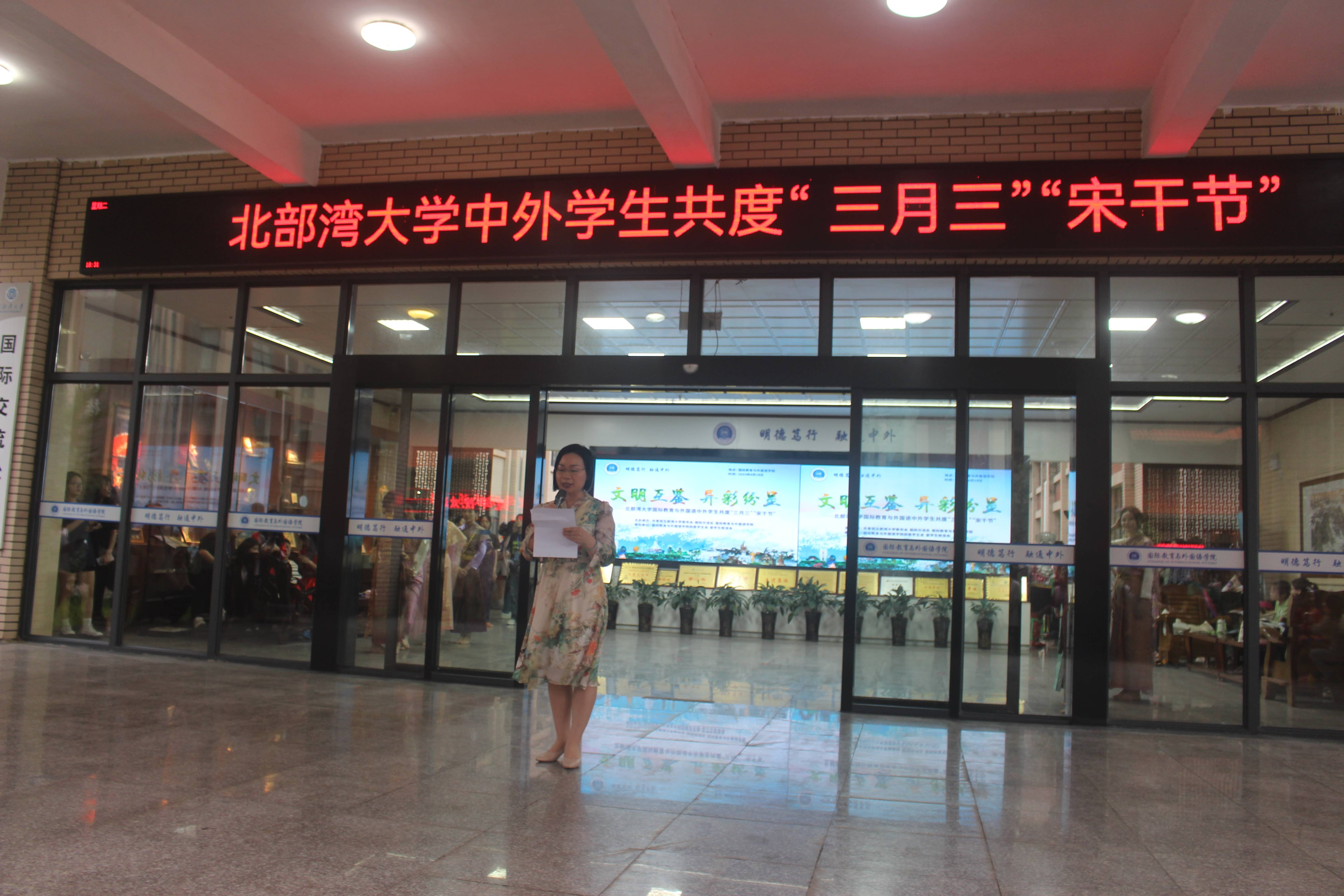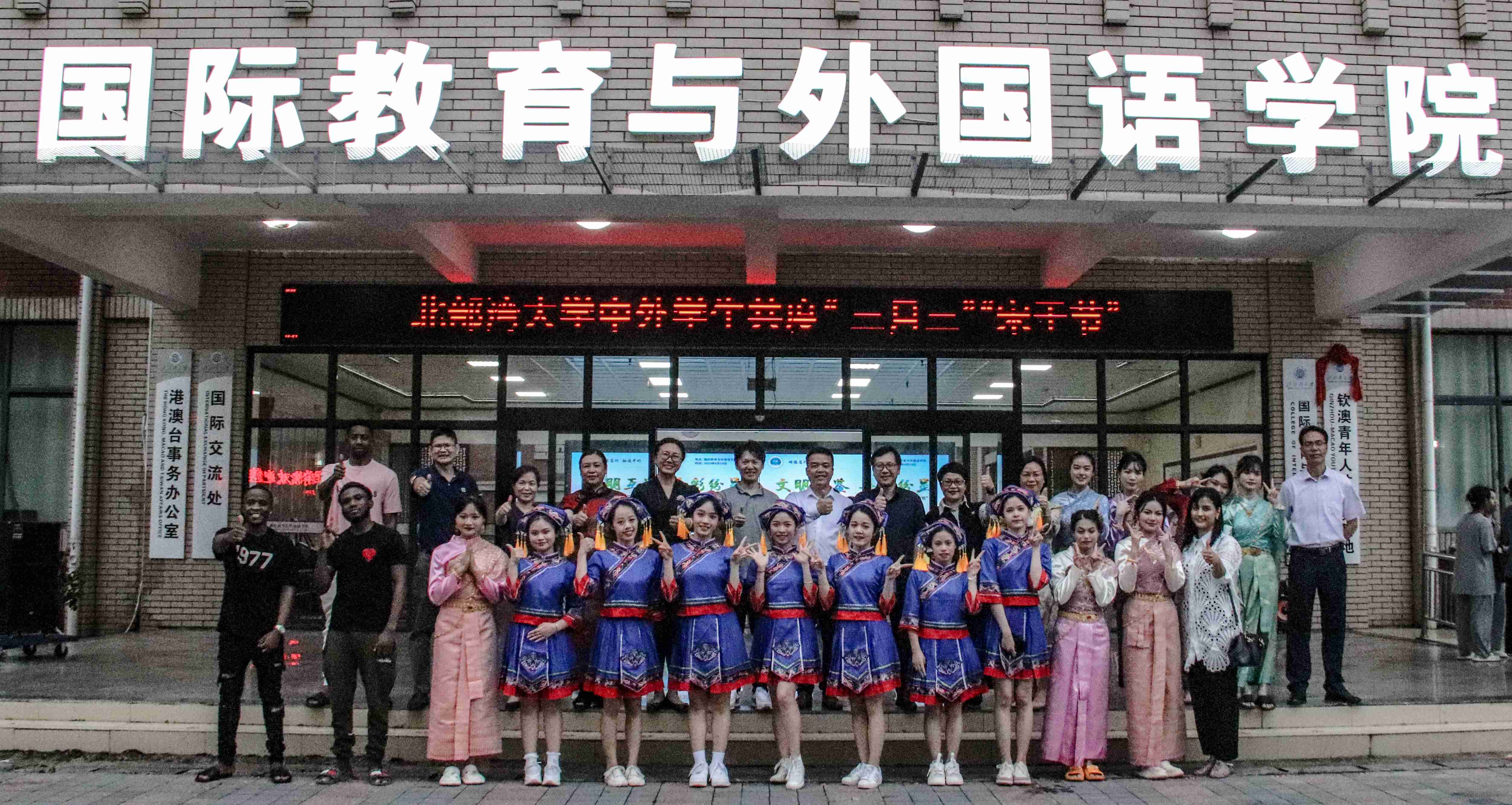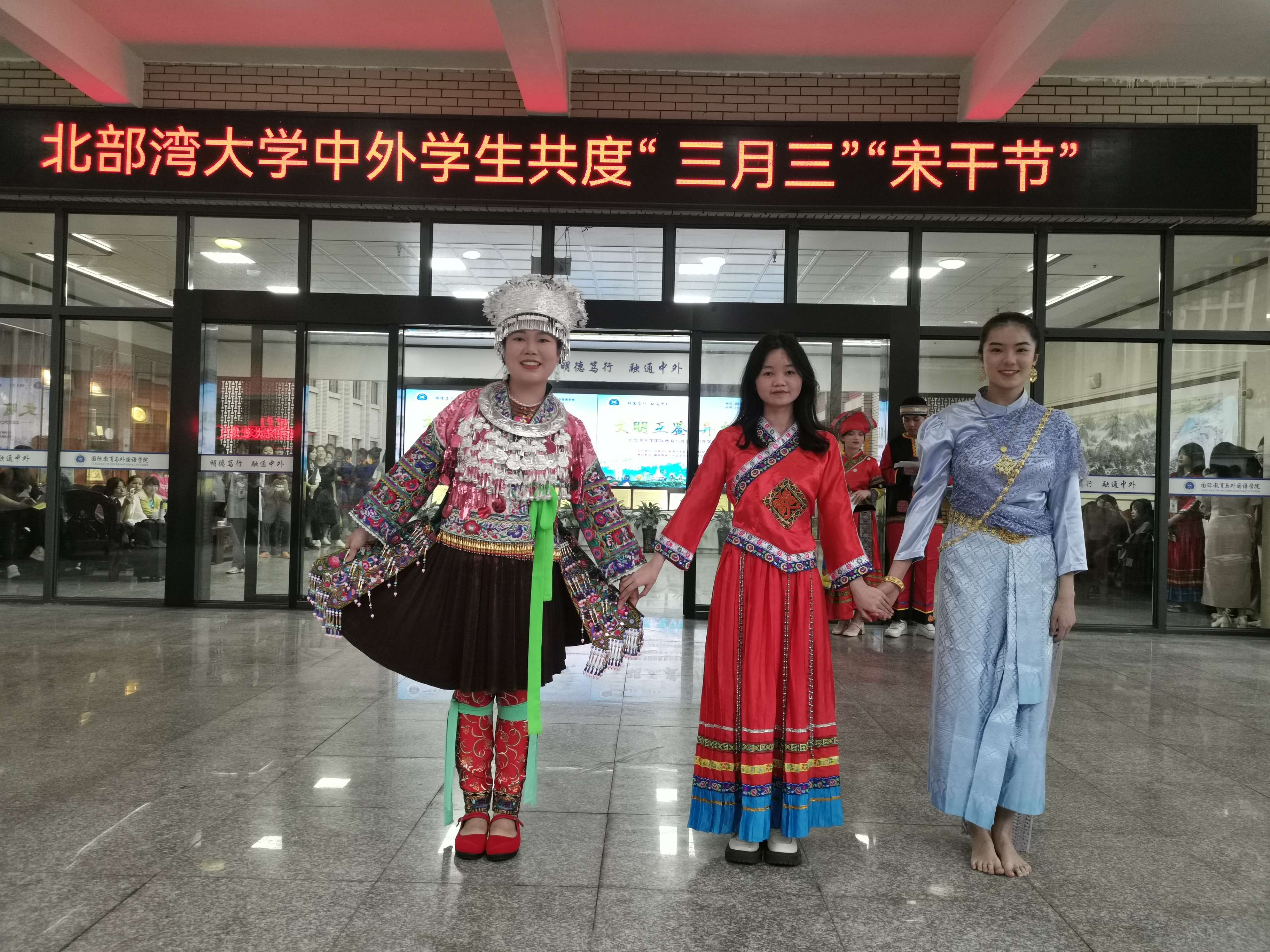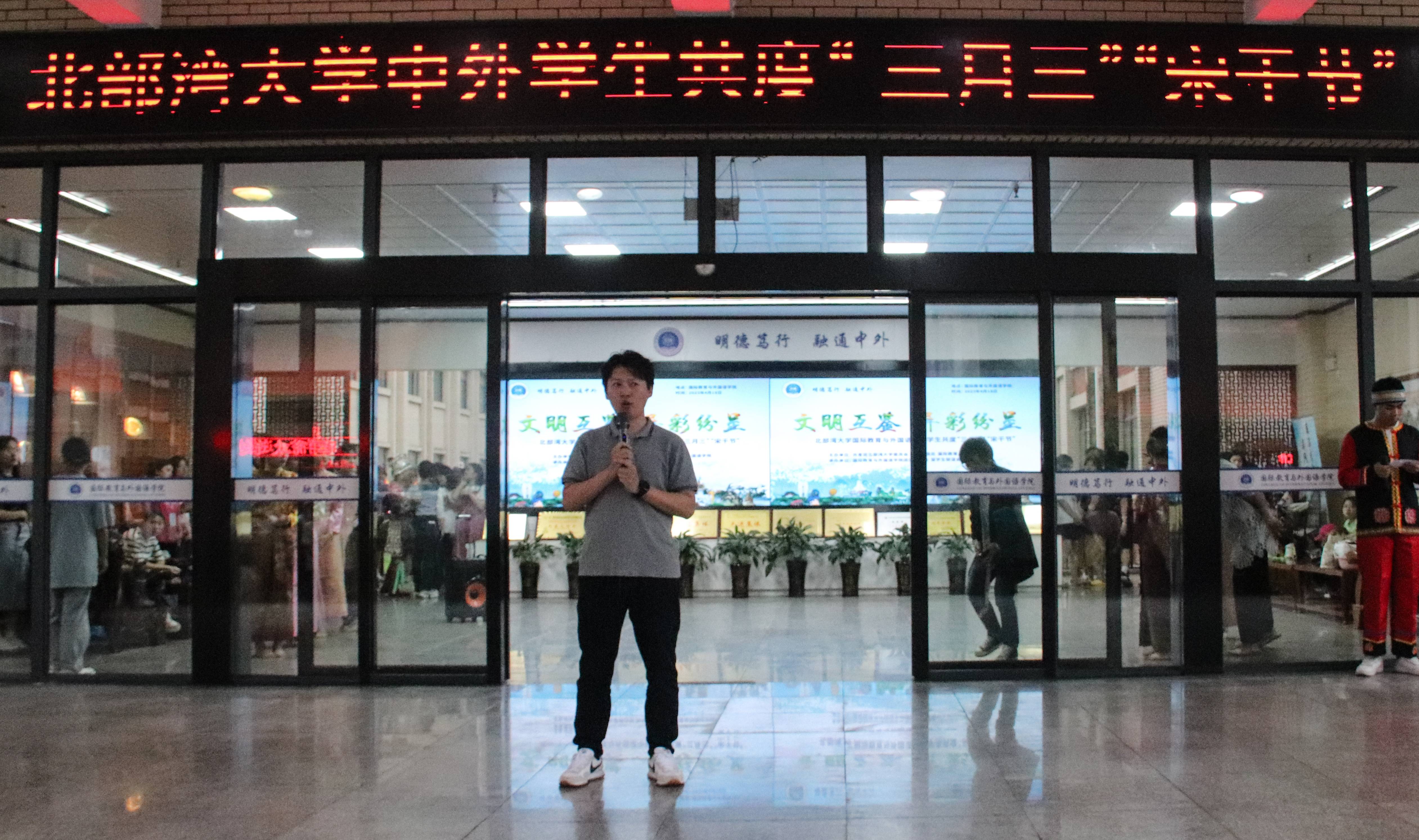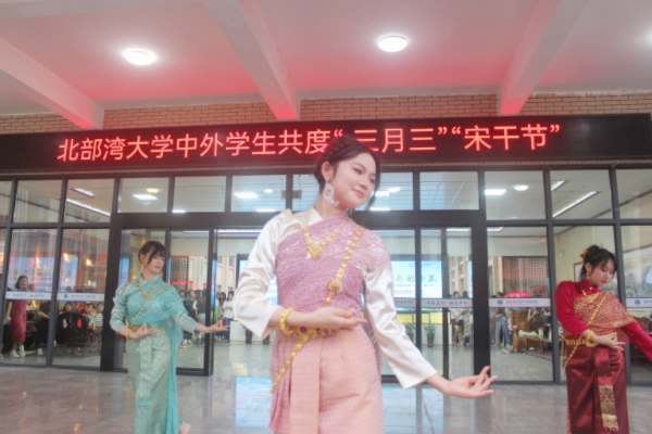为铸牢中华民族共同体意识,营造良好校园文化氛围,丰富广大师生的精神文化生活,提高学生文化自信和人文素质,4月18日下午,由共青团北部湾大学委员会、国际教育与外国语学院主办的文明互鉴、异彩纷呈——北部湾大学中外学生共度“三月三”“宋干节”活动在国际教育与外国语学院开展。校团委书记郑德威、校党委宣传部副部长韦雪敏、国际教育与外国语学院党委书记黎树式、院长冯丽、党委副书记伍红艺、副院长刘卫玲、潘景丽和蔡成龙及全校师生共700余人共同畅享这场富有民族风情和异国风情的文化盛宴。