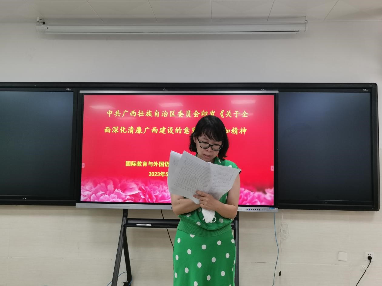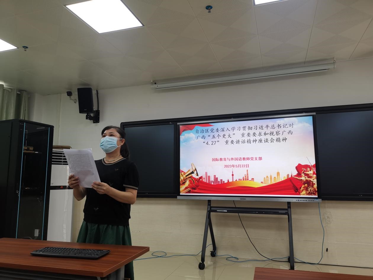 接着,王明霞同志带领大家学习关于学习《习近平著作选读》第一卷、第二卷的通知,这是党和国家政治生活中的一件大事,具有重大而深远的意义。韦春萍同志带领大家学习《中共广西壮族自治区委员会印发关于全面深化清廉广西建设的意见》,深入贯彻落实习近平总书记对广西“五个更大”重要要求和系列重要指示精神,推动清廉广西向纵深发展。马宗娟同志带领大家学习《自治区党委召开深入学习贯彻习近平总书记对广西“五个更大”重要要求和视察广西“4 · 27”重要讲话精神座谈会》,牢记嘱托、勇担使命,紧跟伟大复兴领航人踔厉笃行,努力把习近平总书记为我们擘画的宏伟蓝图变为美好现实。