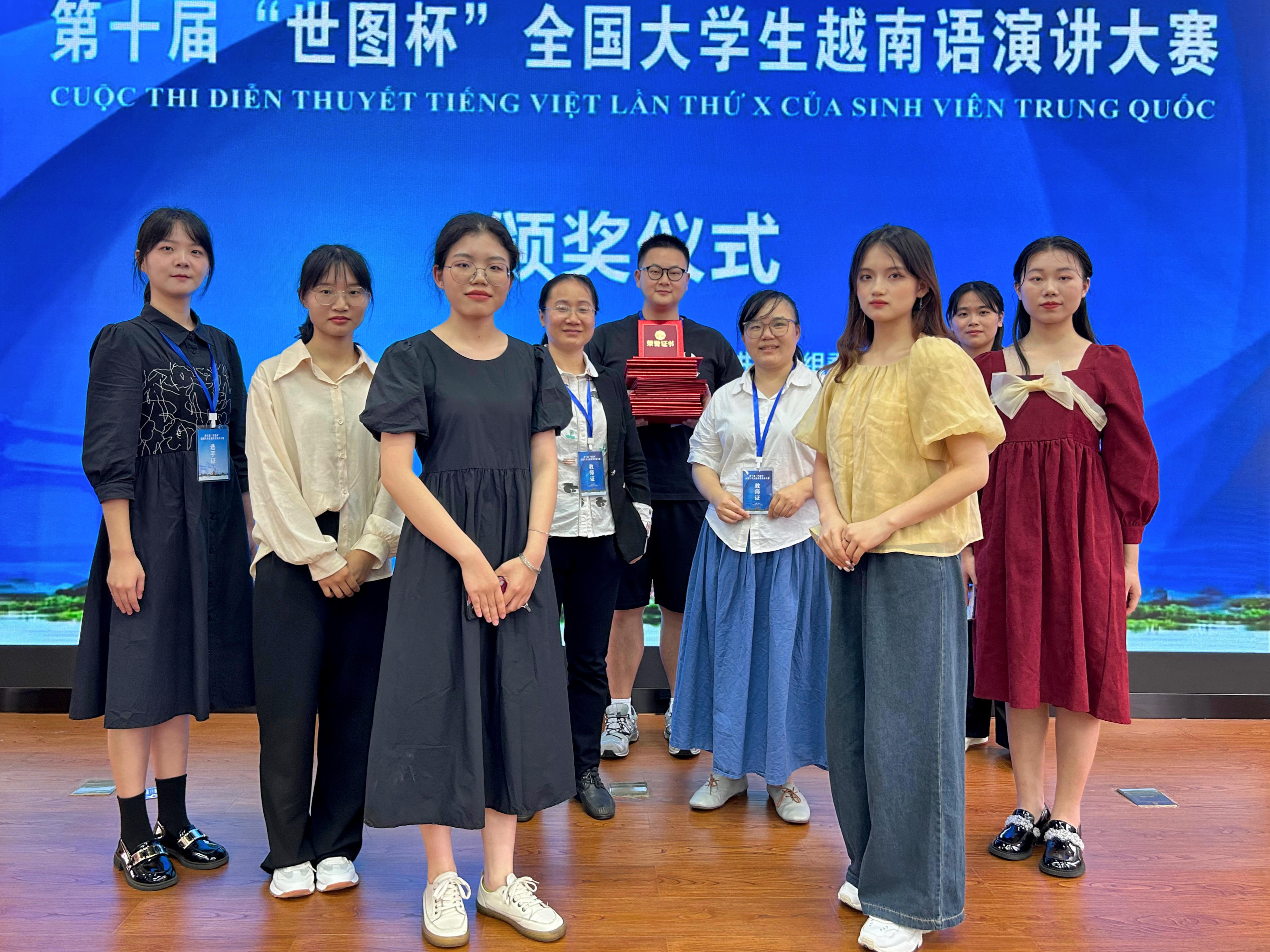 我校派出国际教育与外国语学院越南语专业六名选手参赛。六名选手斩获4个二等奖及2个三等奖。其中梁明芳和黄梓涵同学荣获二年级组二等奖;郑雅琴和陈湘婷同学荣获三年级组二等奖;康茜婷和王洁鸿同学荣获四年级组三等奖。他们的出色表现不仅为学院赢得了荣誉,也彰显了北部湾大学越南语专业学子的实力和才华。