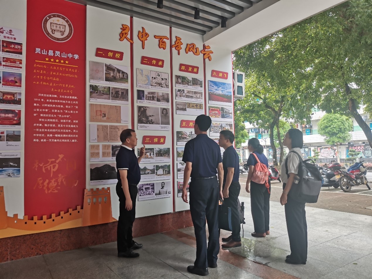 座谈会上,教师党支部与灵山中学就党建工作为主题开展深入交流,详细了解了灵山中学的百年办学历史、办学成果以及“党建+业务”的特色党建经验。黎树式书记首先说明了此次党建交流活动的目的,介绍了我院开展主题教育的做法和经验。简信基校长介绍了灵山中学党建工作情况,他着重强调了“名师党支部”党建和教书育人紧密结合的做法。会后,简校长带领教师党支部的党员参观了灵中智慧党建、百年灵中风云等宣传展示墙,以更直观的方式感受灵山中学党建工作的优秀成果。