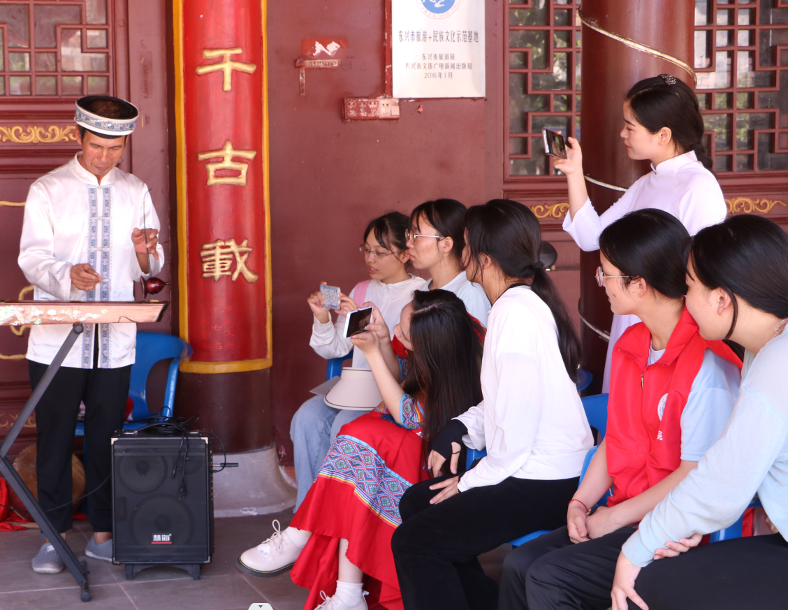 在万尾哈亭,实践团队员们现场学习了独弦琴及京族舞蹈等非遗文化,对万尾村京族独弦琴、京族舞蹈非遗传承人进行访谈,队员们还进行了各族服饰走秀,通过这些活动有效增进了民族团结友爱之情。