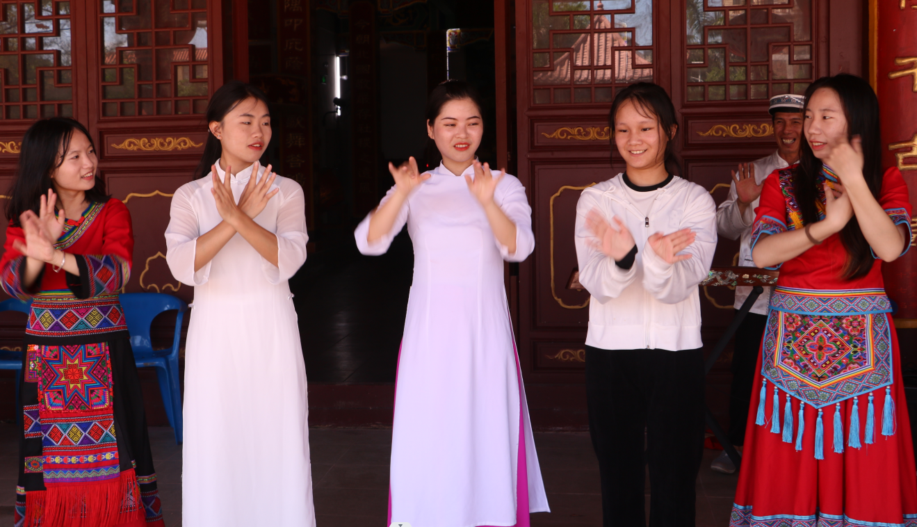 “寻访最美戍边人,唱响民族团结情”社会实践团队成员向万尾村哈妹学习京族舞蹈(谢雅双摄)