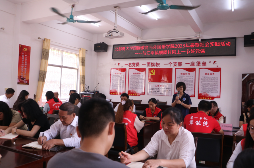在江平镇横隘村,实践团成员与横隘村第一书记及村干部、京族党员同志10余人,同上一节好党课,通过“时代印记”、“抽签答题”、“红歌大比拼”等形式,共同学习习近平新时代中国特色社会主义思想,感受习近平新时代中国特色社会主义思想之伟力,汲取共同奋进新征程、建功新时代的不竭动力。