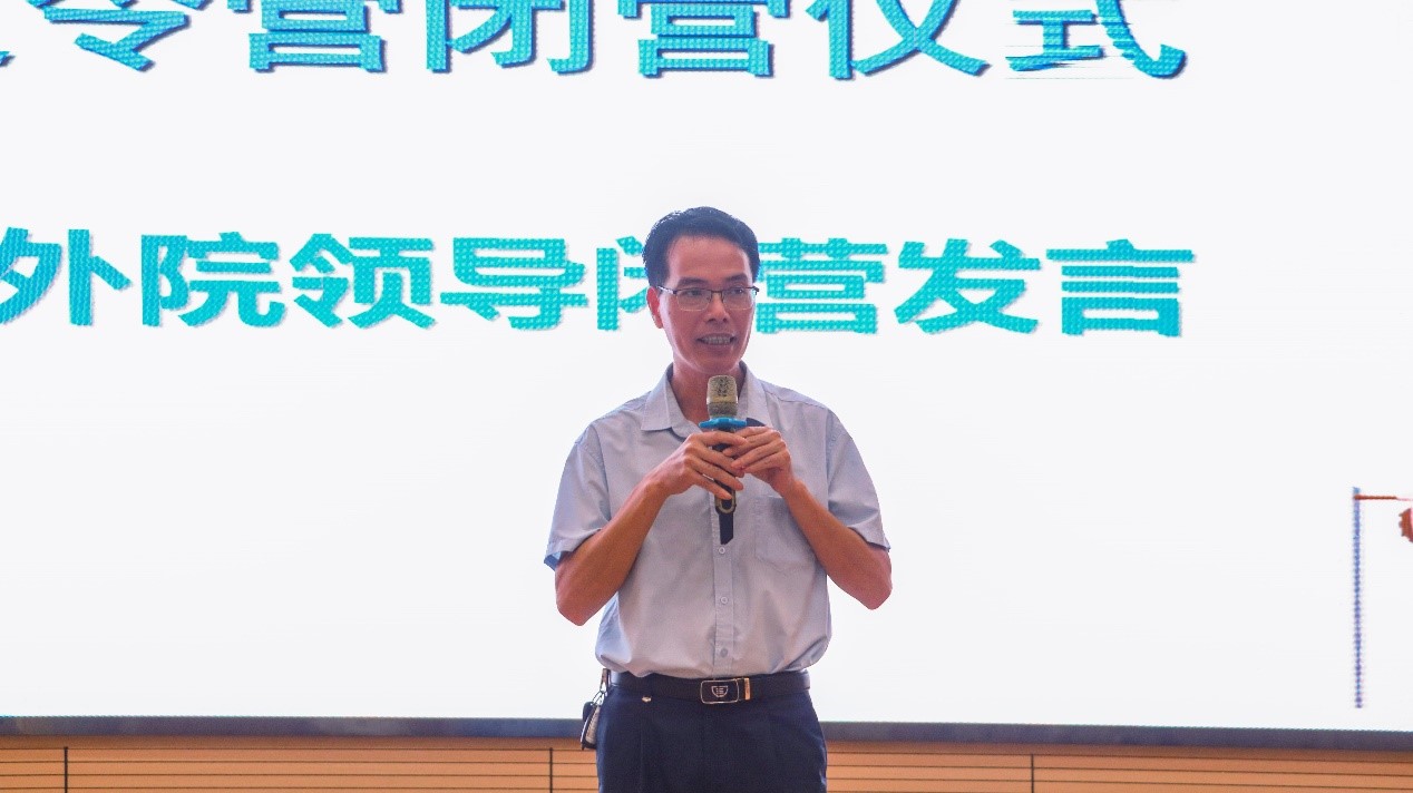 蔡成龙副院长发表闭营致辞。他强调了兴趣的重要性,将兴趣转化为特长,成为自身优势。同时,他对学员们寄予厚望,希望今后学员们学会认真学习,独立自主,团结友爱,学会感恩。