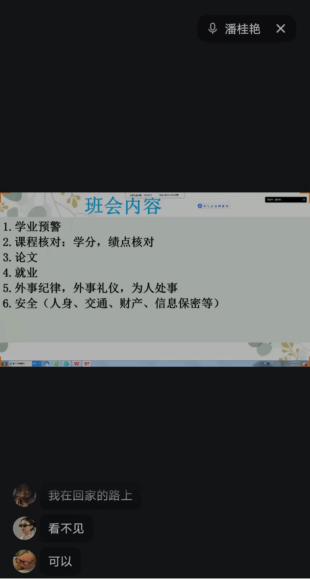 会议伊始,潘桂艳老师针对同学们的出国计划,从自身安全到个人财产及信息安全等方面对同学们进行了一系列的安全教育。其次,潘桂艳老师要求同学们身在国外也要注意相关外事礼仪,发扬中华民族的传统美德。另外,潘桂艳老师根据相关规章制度,和同学们进一步讲述了课程学分的重要性,严格检查每位同学的毕业条件。最后,颜彦老师简要概括了本学年同学们的论文进度安排与国内外课程安排。