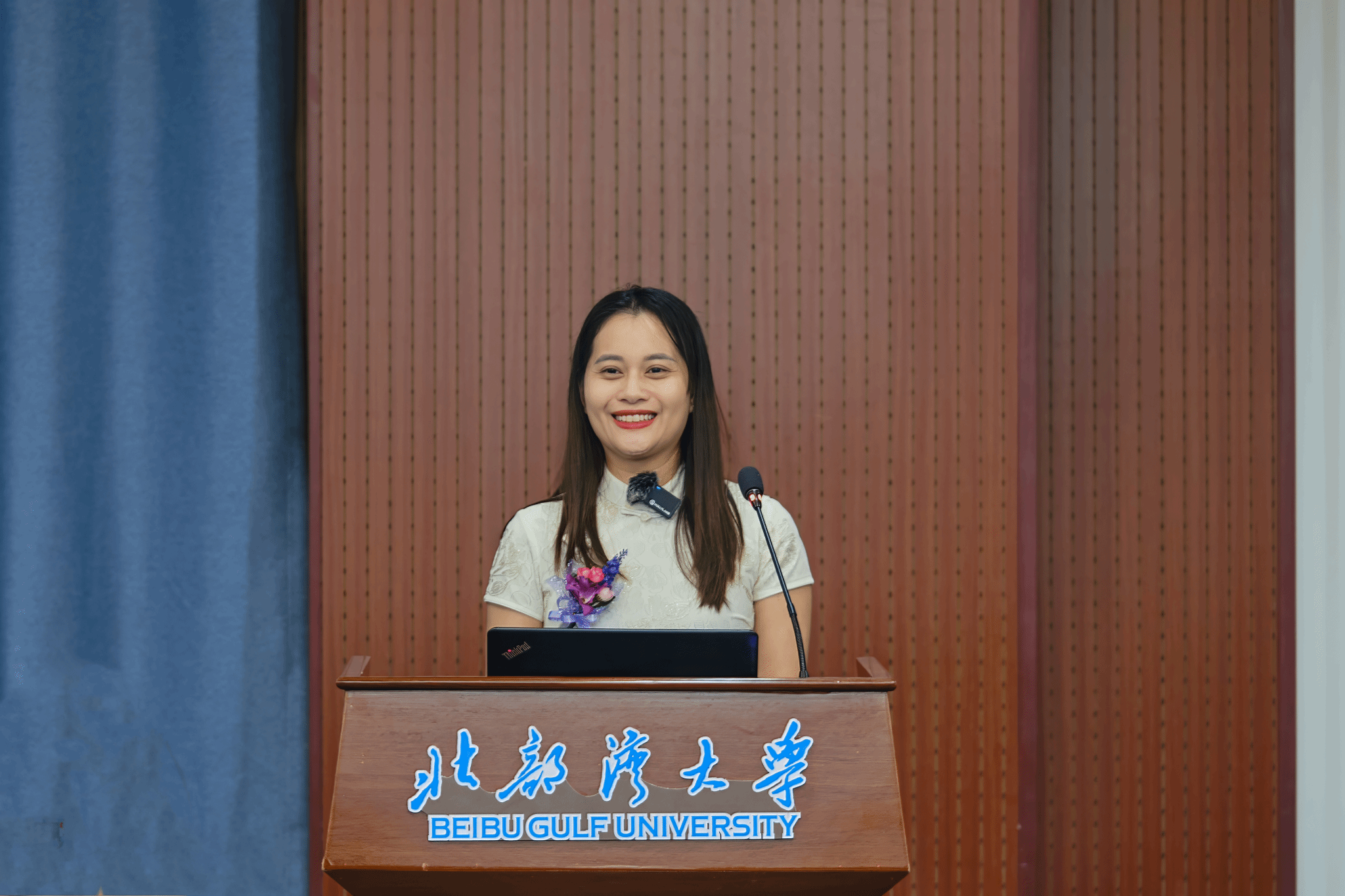 北部湾大学越南校友裴氏金雪以《北部湾大学,我心中永远的母校》为题作报告。她表示在学校老师的鼓励和帮助下在越南开设线上汉语培训机构,消除汉语学习的地理限制,为越南学生带来优质的汉语教育资源, 为更多越南学生搭建了解中国文化的桥梁,加强中国与东盟国家之间的民心相通、交流互鉴。