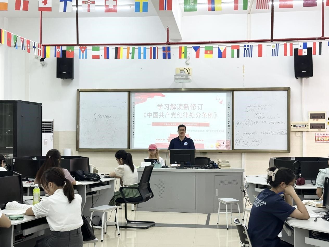 为深入学习《中国共产党纪律处分条例》(以下简称《条例》),教育引导广大学生党员学纪、知纪、明纪、守纪,6月11日下午,外国语学院学生党支部、低年级学生党支部在国际交流中心218教室共同开展了一场主题鲜明的党纪学习教育专题党课。由学院党委书记潘文昊同志授课。
