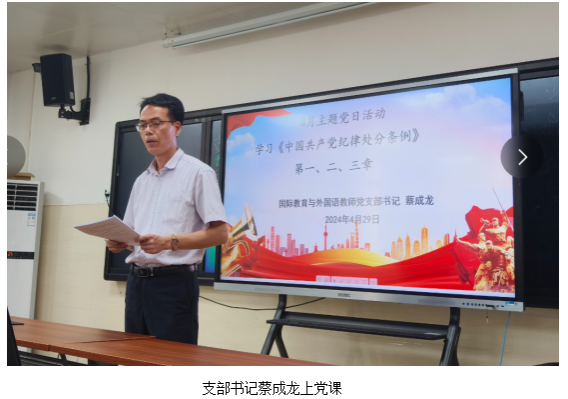 2024年4月29日,国际教育与外国语学院教师党支部书记蔡成龙在党员活动室217给全体教师党员上党课。蔡书记将《中国共产党纪律处分条例》第一、二、三章内容和学院教学科研工作相结合,讲述了党员教师在日常教学科研工作中,要紧密结合《中国共产党纪律处分条例》的总体要求、违纪与纪律处分等内容,合法、依规地开展工作,更好地为学院高质量发展做贡献。