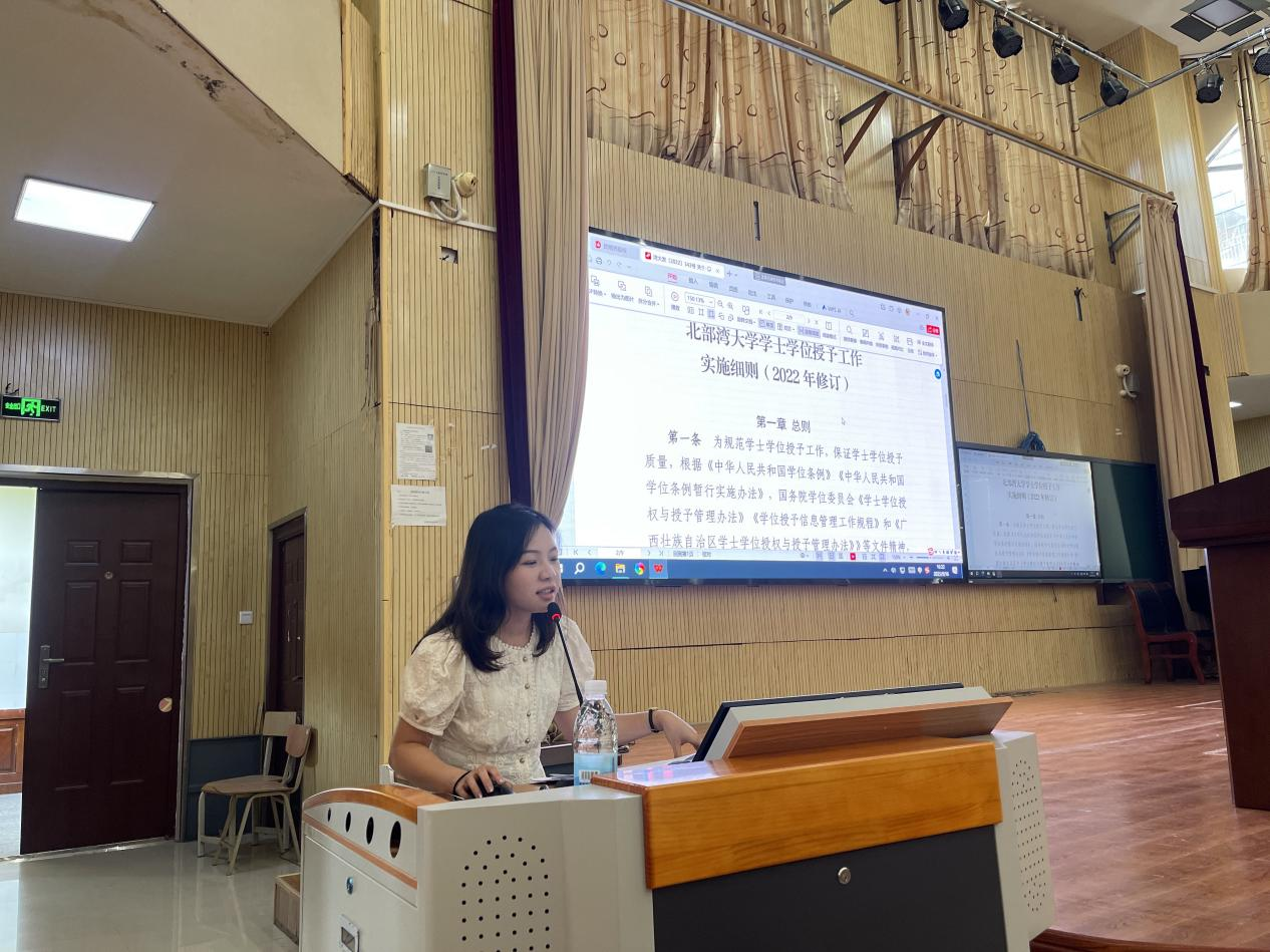 系列活动内容全面、环节紧凑。学院副院长蔡成龙老师首先为新生详细解读了教学管理文件,帮助大家熟悉校规校纪。学院党委副书记伍红艺老师以“融入湾大第一课”为主题,开展了安全教育、预防电信诈骗、宿舍管理规定及班集体建设教育,引导新生自觉遵守校纪校规,树立良好学风,增强了同学们的归属感和法律意识。学工办副主任邱瑞琳老师开展了心理健康教育及第二课堂介绍,辅导员周雪洁老师讲解了资助政策,教务员陈彦君老师则对毕业条件进行了清晰说明。此外,2025级新生辅导员黄树海老师组织同学们系统学习了《北部湾大学章程》《学生手册》等重要文件,重点讲解了综合素质测评、纪律处分及考试违规处理办法。