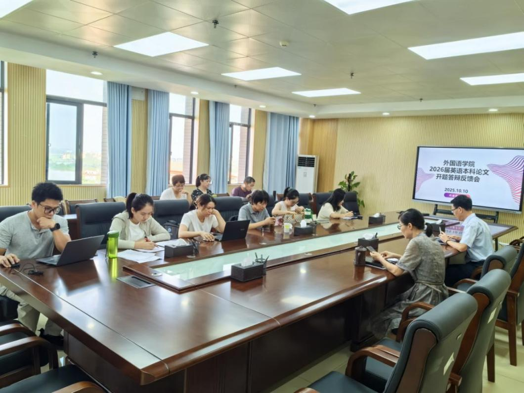 为进一步规范英语专业毕业论文写作,外国语学院于2025年10月10日上午在外国语学院501会议室召开2026届毕业生论文答辩反馈会。本次会议旨在及时总结答辩情况,为毕业生提供针对性的论文修改建议,进一步提升学术素养与研究能力。会议由学院主管全面工作的黎茂昌副院长主持,蔡成龙副院长、各答辩小组组长、答辩组代表教师参会。