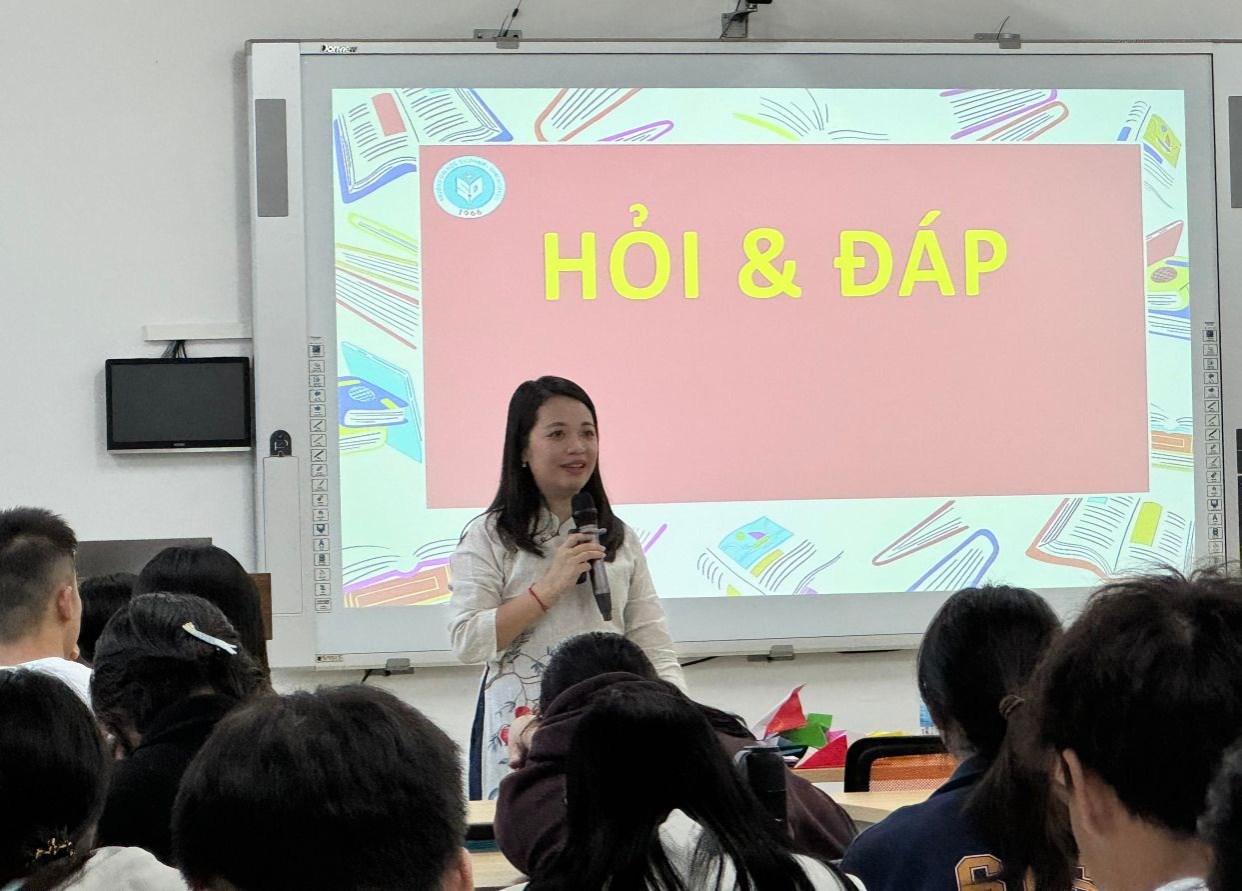 现场互动环节,学生们热情高涨,就学习越南语语音的发音问题及解决方法等向专家请教,会场讨论热烈。此次讲座内容丰富、形式灵活,精彩纷呈,学生受益匪浅。学院蔡成龙副院长总结表示,讲座不仅为学生学习越南语指明了方向、明确了路径,更搭建了中越教学交流平台,进一步深化了两校间的国际交流与合作。未来,学院将持续开展此类跨文化语言研究活动,推动越南语专业教学与研究深入发展,为培养更多优秀越南语专业人才贡献力量。