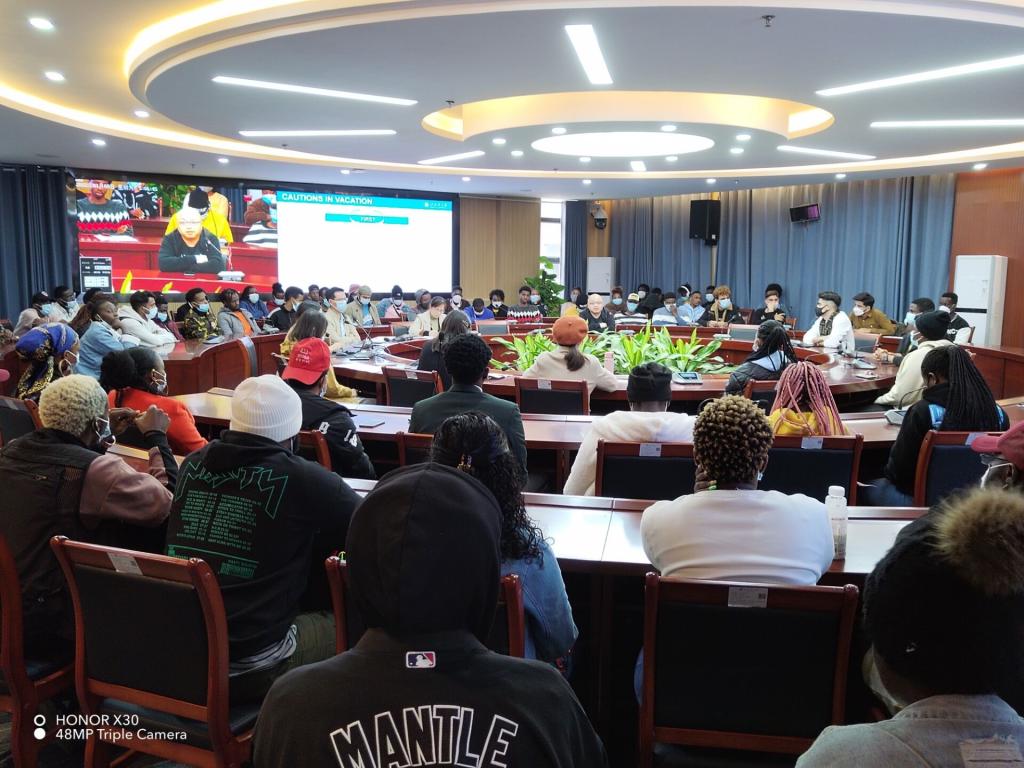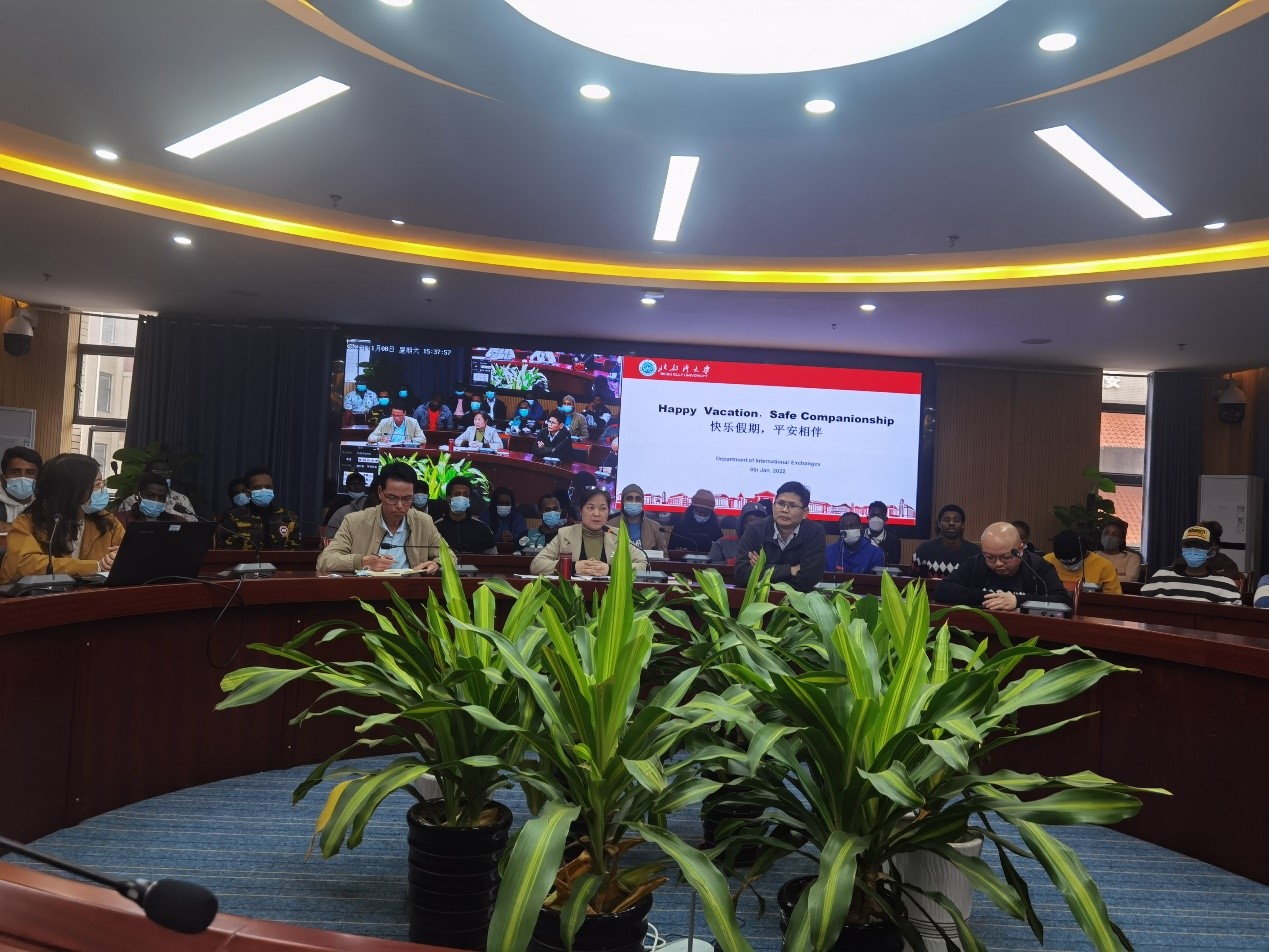 2022年1月8日下午,为增强留学生在寒假的安全意识,普及中国境内法律法规,留学生科及全体留学生于国际交流与外国语学院222会议室开展了“快乐寒假 平安相伴”的主题班会。留学生科全体辅导员,刘卫玲副院长和蔡成龙副院长参加了本次会议。